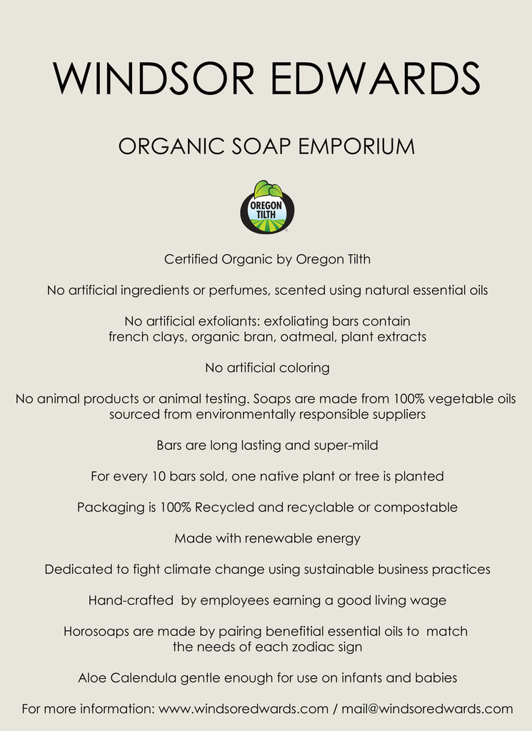 - This Certified Organic Forest Lovers soap is herbaceous and green scented soap, with exfoliating qualities of oatmeal and bran.Saponified Palm*, Coconut* and Olive* Oils, Essential Oils, organic bran, organic oatmeal, chlorella, Natural coloring*. *organic ingredient. Certified Organic by Oregon Tilth Net. wt. 3.75 ozs (105g)